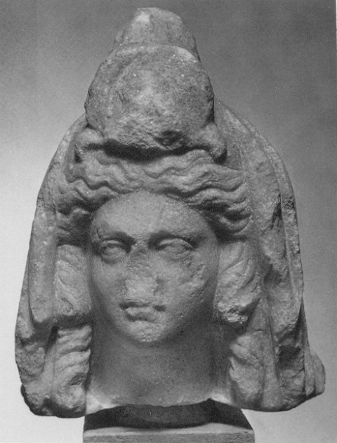 - mythische Figur: Isis mit langen Schulterlocken, Schleier und Lotosknospe über der Stirn