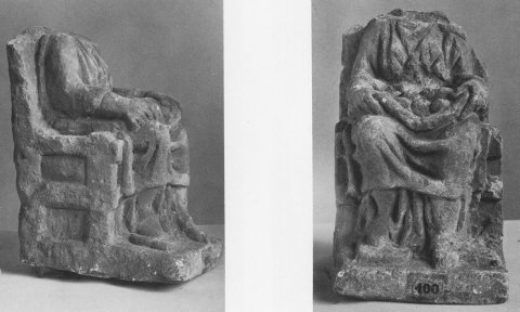 - Mythische Figur: auf einem Lehnsessel thronede Göttin (Sunuxalis ?)in Ärmelgewand und Mantel. Im Mantelbausch auf dem Schoß Früchte, neben dem linken Fuß liegendes Tier (Hund ?).