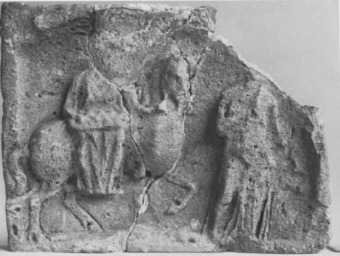 - Mythische Figur: im Damensitz nach rechts reitende Epona, auf den Knien Korb mit Früchten. Vor dem Pferd gehende langgewandete Frau mit Stab oder Fackel (?).