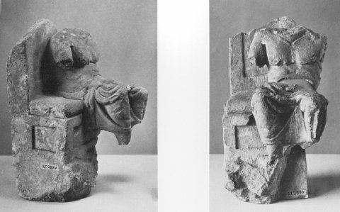- mythische Figur: thronender Jupiter, Mantel um die Hüften, Thron mit Kissen