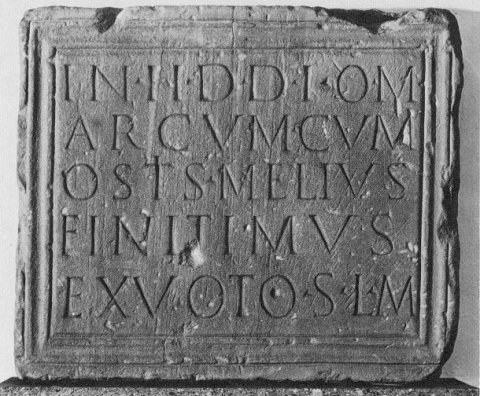 - In h(onorem) d(omus) d(ivinae) I(ovi) O(ptimo) M(aximo) / arcum cum / osti(i)s Melius / Finitimus / ex voto s(uscepto?) l(ibens) m(erito)