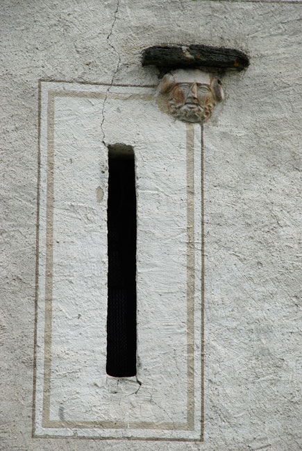 - Mythische Figur (Jupiter Ammon): bärtiges Gesicht mit Widderhörnern. Stirnseite eines Firstbalkens.