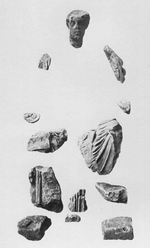 - mythische Figur: Kopf, Gewandteile, Fruchtschale einer thronenden Muttergöttin, Teile der Plinthe