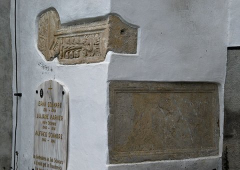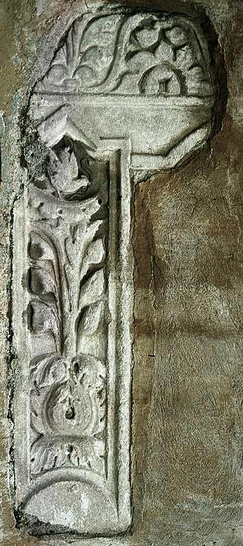 - Tiere: schmales senkrechtes Feld mit Giebel, unten halbrund eingezogen. Akanthusornament, darauf Vogel mit Schlange im Schnabel. Rest des oben ansetzenden horizontalen Rahmenfeldes mit Palmetten-Rankenfries.