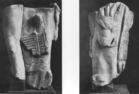 - oben, unten u. links abgebr., erhalten nur 1 Bein mit Stütze