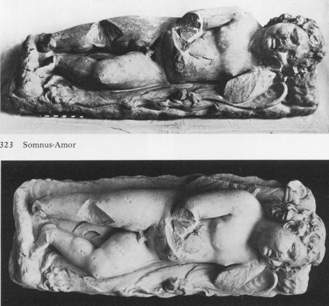 - mythische Figur: auf einem Löwenfell liegender Amor (Eros, Somnus?), in der rechten Hand zwei Mohnstängel