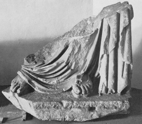 - Plinthe (links abgebr.) mit Füßen und Gewandresten erhalten