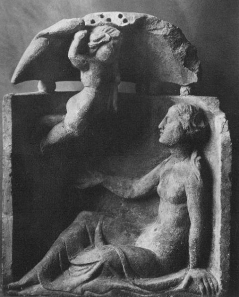 - Mythos: rechteckige, gewölbte Bildnische, darin auf dem Boden aufgerichtet sitzende Danae, Mantel um die Beine, aufblickend zum fast freiplastisch über ihr schwebenden kindlichen Eros. Die bekrönende Muschelnische liegt auf sechs (erhalten sind vier) Kugeln auf dem oberen Rahmen des Reliefs.
