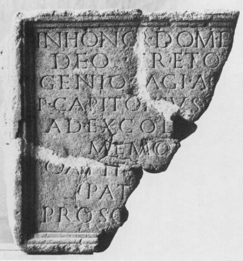 - In honor(em) dom(us) d[ivin(ae)] / deo Creto[ni et] / Genio [p]agi AC(?)[---] / P(ublius) Capitonius [---] / ad excol[endam] / memor[iam] / Capiton[i ---] / pat[roni] / prosc[aenium ---]