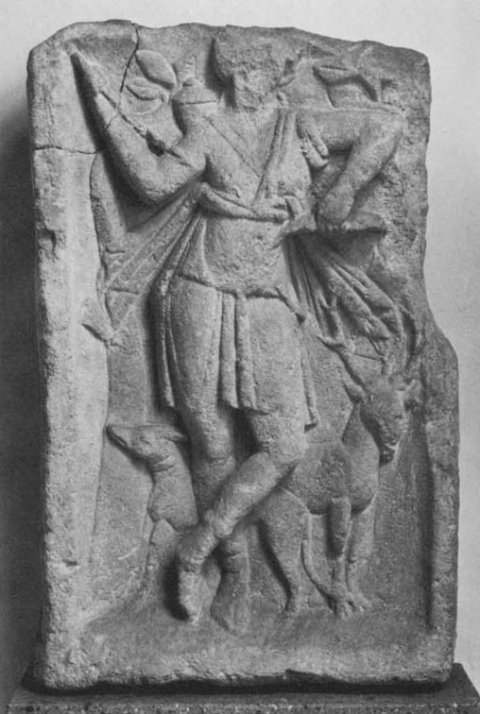 - Mythische Figur: mit überkreuzten Beinen stehende Diana in kurzem Chiton, der die rechte Brust freilässt, um die Taille gewickeltem Mantel und Stiefeln, in der linken Hand Bogen, in der rechten Pfeil. Köcher hinter der rechten Schulter. Hinter dem rechten Bein sitzender Hund, hinter dem linken stehender Hirsch. Seitlich je ein Baum.