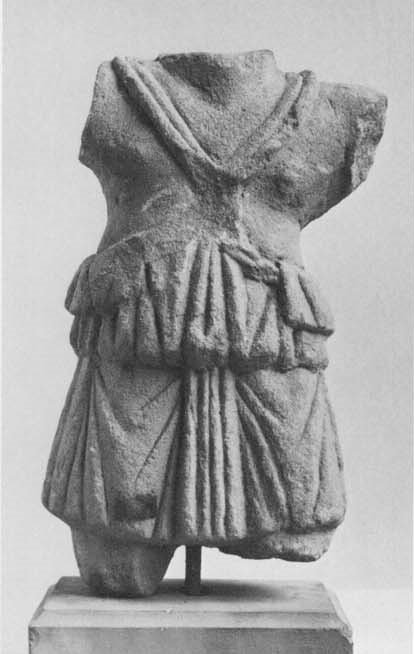 - Mythische Figur: jagende Diana in kurzem auf der Brust zusammengerafften Chiton, der beide Brüste entblößt. Der linke Arm war ausgestreckt, die Rechte griff wohl zum Köcher, der auf dem Rücken hängt.