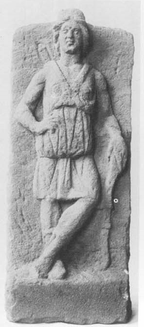 - Mythische Figur: rahmenlose Platte mit vorspringender Standfläche, darauf mit überkreuzten Beinen stehende Diana mit Diadem, im kurzen, vor der Brust geraffen Chiton und Stiefeln; beide Brüste entblößt, in der linken Hand Bogen, rechte Hand in die Hüfte gestützt, hinter der rechten Schulter Köcher.
