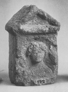 - sogen. Hausstein: Häuschen mit Satteldach, unter dem einen Giebel weibliche (?) Büste