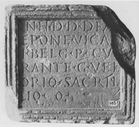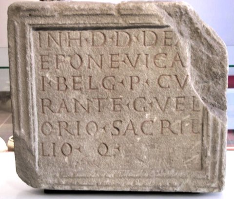 - In h(onorem) d(omus) d(ivinae) dea[e] / Epon(a)e vica[n]/i Belg(inates) p(osuerunt) cu/rante G(aio!) Vel/lorio Sacril/lio q(uaestore)
