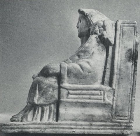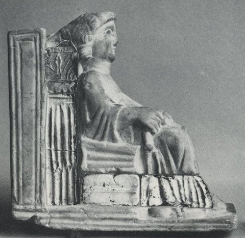 - Mythische Figur: thronende Fortuna in gegürtetem Ärmelchiton und Mantel, Füllhorn im linken Arm, in der rechten Hand Griff (Rest vom Steuerruder ?). Augen waren eingelegt. Seitenlehnen und Seiten der Rückenlehne profiliert, auf der rechten Seite hinter der Göttin sekundär eingefügter Pilaster mit Blattkapitell.