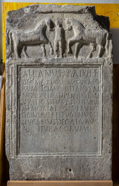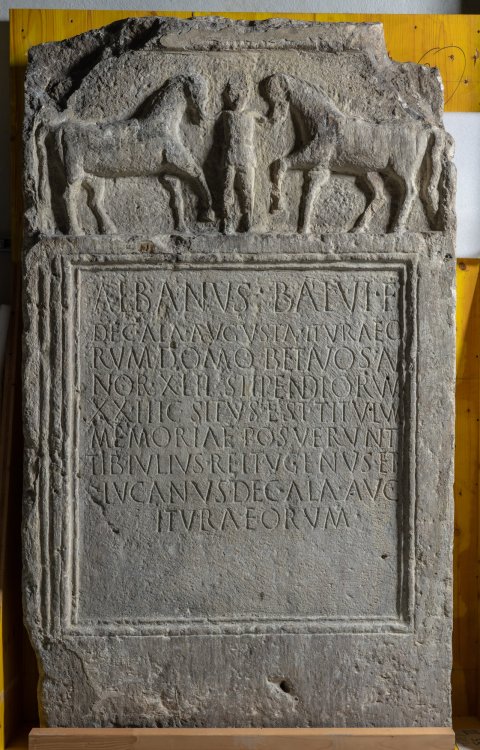 - Albanus Balvi f(ilius) / dec(urio) ala Augusta Ituraeo/rum domo Betavos (!) an/nor(um) XLII stipendiorum / XX hic situs est titulum / memoriae posuerunt / Tib(erius) Iulius Reitugenus et / Lucanus dec(urio) ala Aug(usta) / Ituraeorum