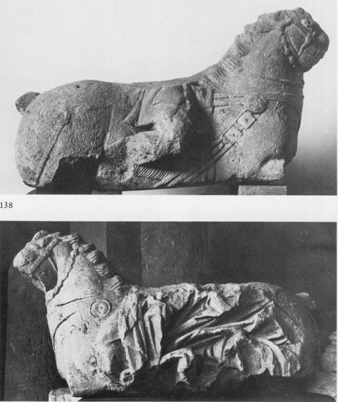 - mythische Figur: Jupiter auf gezäumtem Pferd (Brustgurt mit Lunulae, Satteldecke mit Fransen)