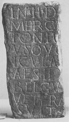 - In h(onorem) d(omus) [d(ivinae) deo] / Mercu[rio An]/toniu[s ---]/us quo[d corn]/icula[rius pr]/aesid[is prov(inciae)] / Belg(icae) v[ovit] / vetera[nus po]/suit [l(aetus) l(ibens) m(erito)]