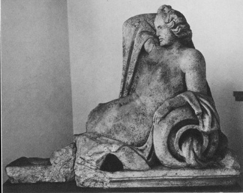 - Mythische Figur: auf profilierter Basisplatte gelagerte Quellnymphe, Mantel um rechten Arm, Rücken und Beine, der linke Arm ruht auf einem liegenden Wassergefäß, der rechte ist zum Kopf erhoben.