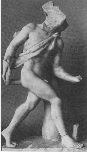 - Vorderteil des Kopfes, Enden des Pedums, Finger der linken Hand, rechte Hälfte der Plinthe abgebr.,