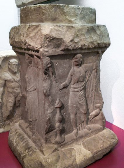 - Mythische Figuren: Juno mit Szepter in der rechten und Fackel in der linken Hand, an ihrer rechten Seite Thymiaterion, zu ihrer Linken Pfau; Mercur, Mantel über dem linken Arm, in dem er den Caduceus hält, in der Rechten Geldbeutel, neben dem rechten Bein Hahn, neben dem linken liegender Widder; Hercules mit Löwenfell, Köcher und Keule; Minerva mit Helm, Aegis, Lanze und Schild. Oben und unten Gesimse mit Kymation, auf der Oberseite achteckiger Sockel (für den oben folgenden Wochengötterstein) mit Inschrift.