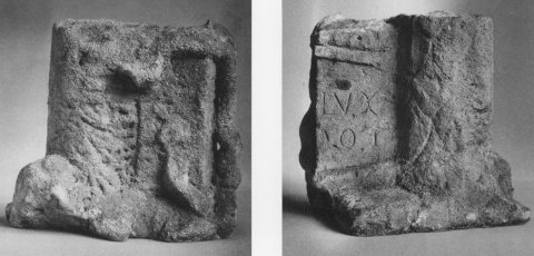 - Vor einem Altar, der links von einer Schuppensäule flankiert wird, Reste des linken Beins und Fußes einer stehenden Figur; auf dem Altar Rest der linken Hand, die sich auf Keule stützt ? Hercules ? Auf der Rückseite des Altars später eingeritzte Buchstaben.