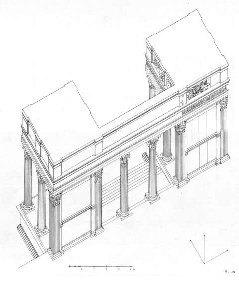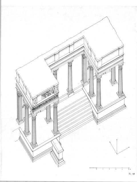 - Propylon mit Freitreppe zwischen vorgezogenen Podesten, darauf korinthische Säulen, Architrav, Rankenfries, Konsolgesims und Attikazone mit Relieffeldern. Vorhalle des Tempels der Kapitolinischen Trias ?