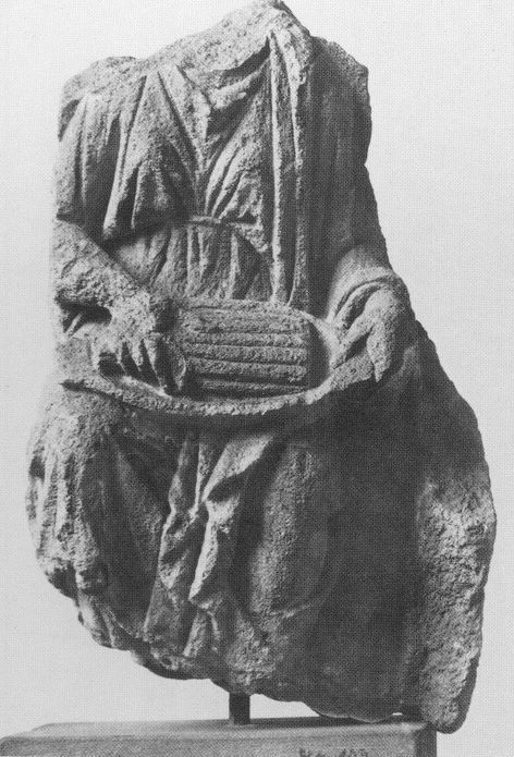 - Mythische Figur: thronende Muttergöttin in gegürtetem Chiton und Mantel, die Hände halten eine ovale Platte, darauf kurze Stangen.