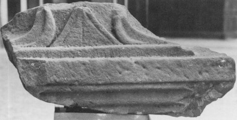 - Fragment der Bekrönung eines großen Altars, über der Deckplatte kleiner Giebel zwischen Volutenhaken (?).