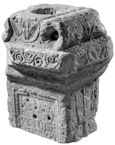 - Pulvini mit Rosetten, Deckplatte mit Spiralranken, gerahmte Schriftfelder, auf den Nebenseiten Blitzbündel und Kanne