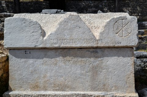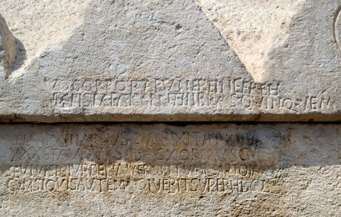 - Fl(avius) Virgilianus qui bixit(!) annus(!) / XXX et Aur(elia) Ursilla oxor(!) eius qui / se vivi sibi urdenaverunt(!) (h)unc sar<c>ofa/gum si quis autem voluerit super h(a)ec d//uo corpora punere(!) infere<t> / [san]c(tae) ec(c)lisiae(!) argenti libras quinque{m}