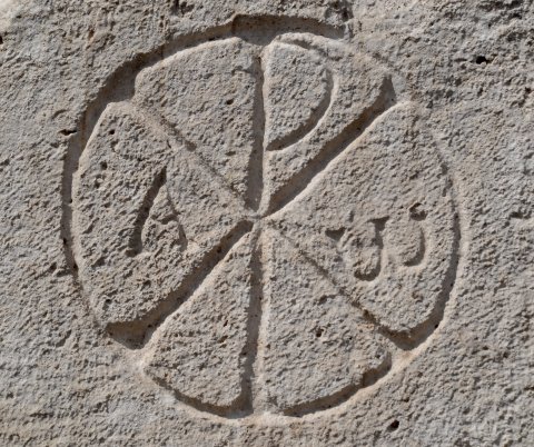 - Dachförmiger Deckel mit Giebel zwischen Eckakroteren, im rechten Christogramm mit Alpha und Omega.