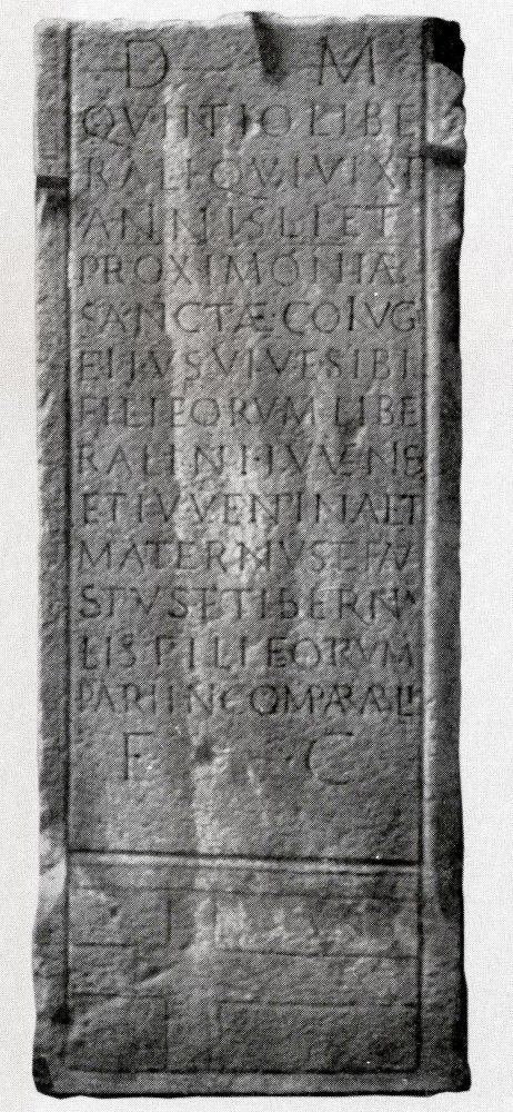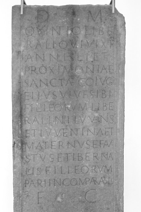 - D(is) M(anibus) / Quintio Libe/rali qui vixit / annis LI et / Proximoniae / Sanctae co(n)iugi / ei{i}us viv(a)e sibi / fili(i) eorum Libe/ ralini Iuvenis / et Iuventina et / Maternus et Fau/stus et Tiberna/lis fili(i) eorum / patri incomparabili / f(aciendum) c(uraverunt)