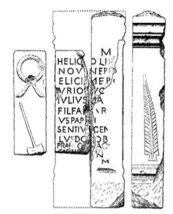 - auf den Nebenseiten links Kranz und Axt, rechts Palmzweig