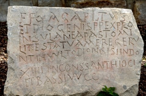- FF(lavii) Agapistus / et Diogenis p(rimi)p(ilarii) ex pro[v(incia)] / Insulanea pasto mi/lite statuam eregeru/nt(!) in vulto Dionisi{si}(!) ind(ictione) / XIIII in conss(ulatibus) Anthioci(!) / et Bassi vv(irorum) cc(larissimorum)