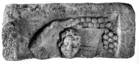 - Auf der Vorderseite Rest einer Nische (für Grabporträts) und Rosette. Auf der links anschließenden Nebenseite Kopf und erhobener rechter Arm einer Frau, die einen Korb mit Weintrauben auf der linken Schulter trägt.