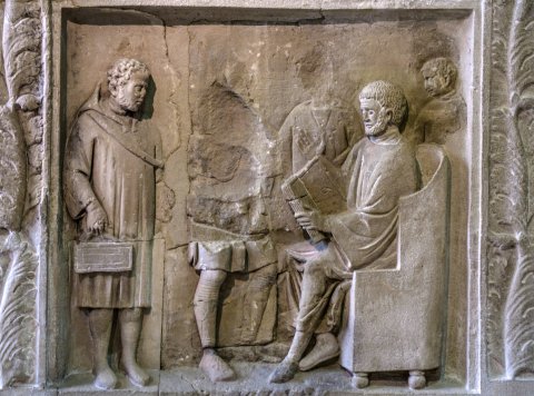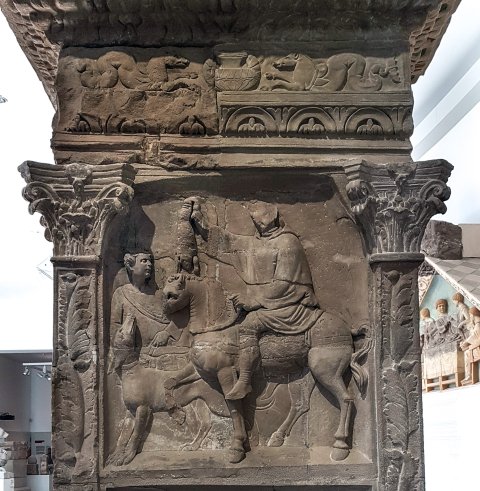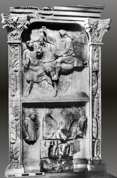 - Rechte Nebenseite: zwischen Pilastern mit Akanthusblättern und korinthischen Kapitellen zwei Bildfelder. Im oberen Jagdszene mit Reiter im Kapuzenmantel, in der erhobenen Rechten Hase; neben dem Pferd Jagdgehilfe und Hund. Im unteren Feld Kontorszene mit sitzendem Mann mit Diptychon und von links herankommendem bärtigen Mann im Kapuzenmantel; im Hintergrund drei Männer (Diener).