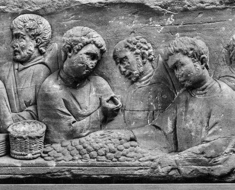 - Nebenseite eines Pfeilergrabmals: Kontorszene mit sieben Männern um einen mit Münzen beladenen Tisch.