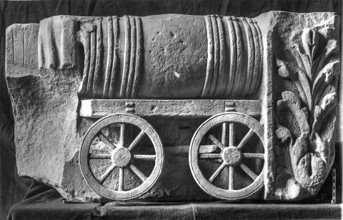 - Wagenszene: vierrädriger Karren, darauf ein großes Fass, links Reste vom Gewand des Kutschers, rechts Rahmen mit Blattkelch.