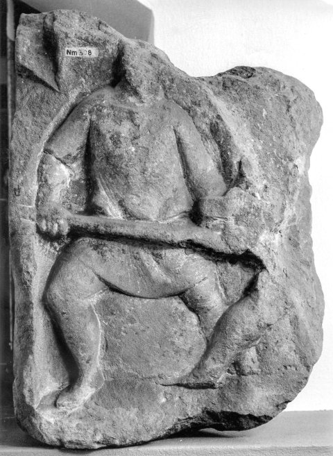 - Rechte Nebenseite des Blocks mit der Grabinschrift: nach links hin ausschreitender Mann in kurzer Tunica, packt mit beiden Händen lange Stange, sein linkes Bein wird vom linken Bein einer weiteren Person überschnitten.