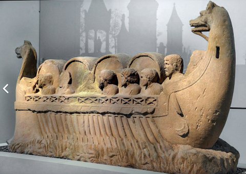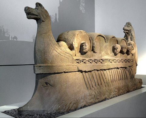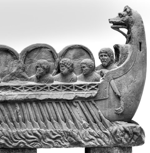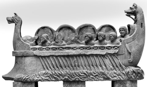 - Schiff mit 22 Rudern, am Schiffsschnabel Augen, Bug und Steven mit Drachen- bzw. Hundekopf, hinter der gegitterten Reling Köpfe und Schultern von sechs nach vorn blickenden Männern, hinter ihnen vier große Fässer. Die Ruderer sind unter Deck nicht sichtbar. Am Heck sitzen zwei Männer nebeneinander, die jeweils ein Steuerruder führen. Am Bug sitzt ein nach rückwärts gewandter Mann. Rekonstruiert wird die Bekrönung des Grabmals mit einem Aufsatz aus 14 Amphoren zwischen zwei nebeneinander liegenden Schiffen.