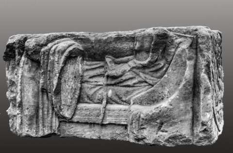 - Vorderseite: Rest der Grabinschrift, rechts Rahmen mit Ornament. Rechte Nebenseite: auf einer Kline gelagerte Frau mit nacktem Oberkörper, in den Händen Brustband; von links herantretende Dienerin mit Gewand in den Händen. Rückseite: Kassetten mit Rosetten.