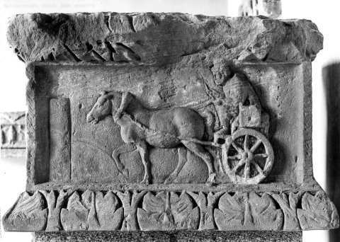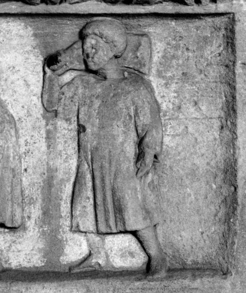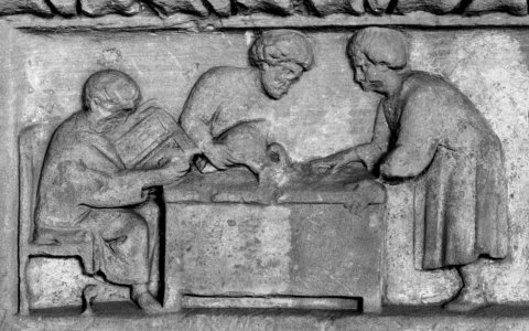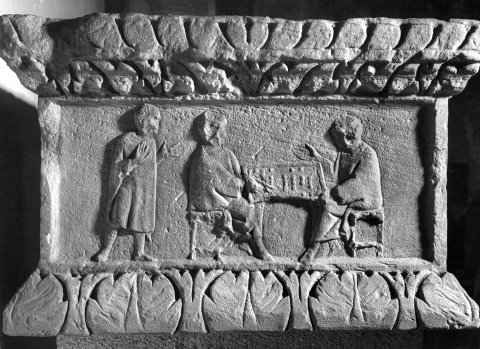 - Auf drei Seiten reliefierter Block, Gesims oben und unten. Vorderseite: Kontorszene mit links an einem Tisch sitzendem Mann mit Polyptychon, zwei Männer schütten Münzen auf den Tisch, ein weiterer kommt von rechts mit einem Sack über der Schulter. Rechte Nebenseite: Wagenszene mit einspännigem Karren mit Kutscher und Zugpferd. Am linken Bildrand Meilenstein. Linke Nebenseite: zwei auf Klapphockern sitzende Männer beim Brettspiel, links stehender Zuschauer.