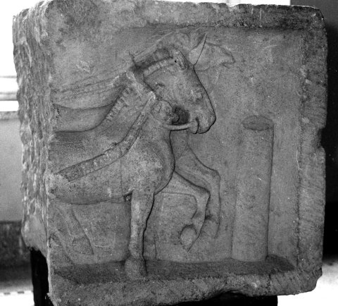 - Wagenszene: nach rechts gehendes Zweigespann von Pferden, vor ihnen Meilenstein