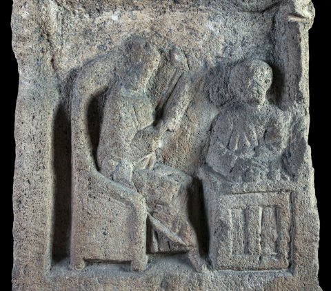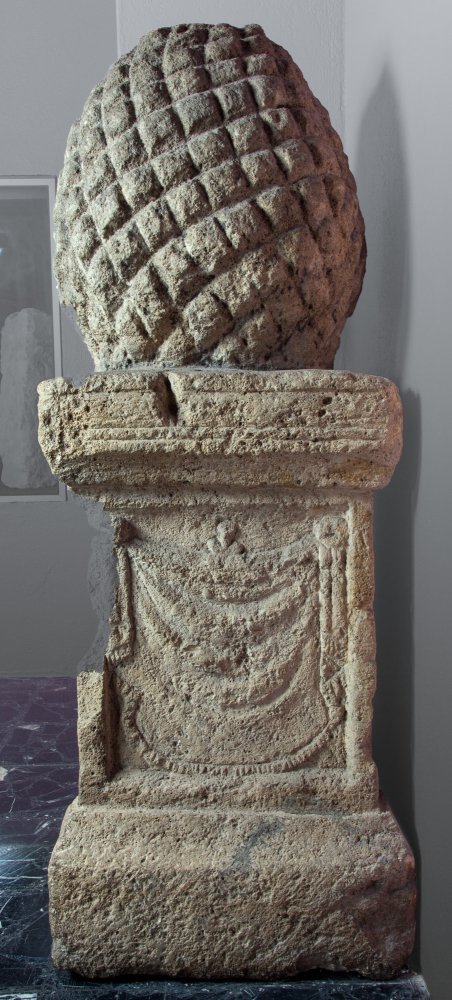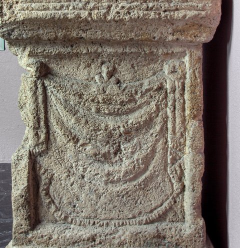 - Altarförmiger Stein, auf der Vorderseite Kontorszene mit Mann im Lehnsessel, in der Hand Schreibtafel, vor ihm truhenförmiger Tisch, auf dem Münzen liegen; hinter dem Tisch stehender Diener. Auf den Nebenseiten aufgehängte Draperie, darüber geflügelte Büste. Als Bekrönung großer Pinienzapfen.