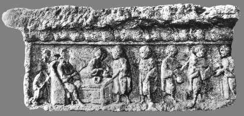 Auf der links anschließenden Schmalseite Mann in kurzer Tunica, der am Fuß eines Baumes einen Korb ausleert. Hinter ihm stehede Frau. Auf beiden Seiten oben vorspringendes Gesims.