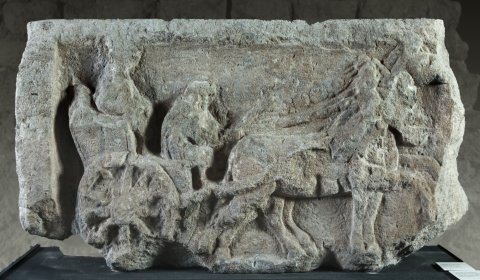 - Wagenszene: zweirädriger Karren mit Zweigespann nach rechts. Auf dem Wagen Sessel mit Fahrgast, vor ihm Kutscher.