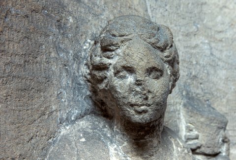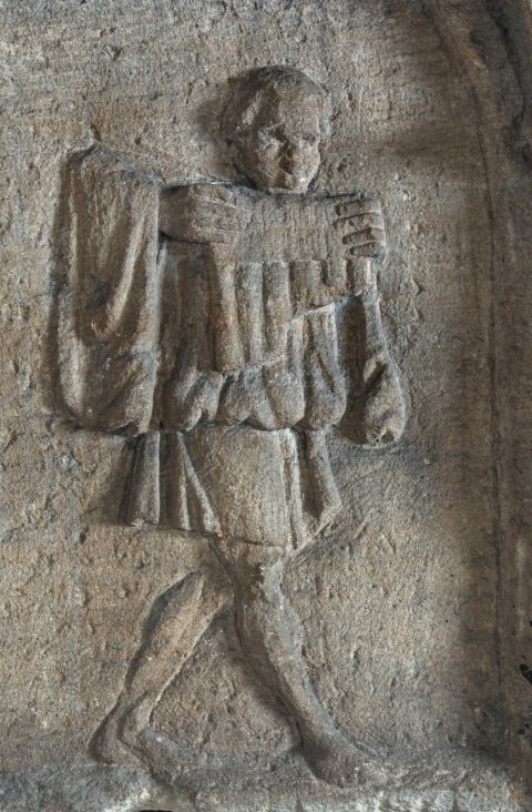 Auf der linken Nebenseite Bogenfeld zwischen Pilastern mit Blattdekor, darin Mann in kurzer Tunica in Schrittstellung, in beiden Händen große Syrinx.