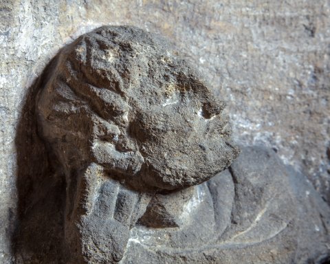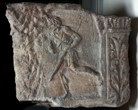 Auf der rechten Nebenseite nach links laufender bartloser Mann in kurzer gegürteter Tunica, in der linken Hand langer Dreizack (Fischer). Von den flankierenden Pilastern nur der rechte erhalten.