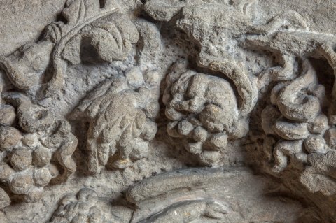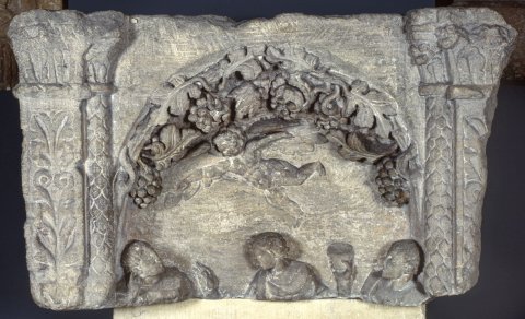 Totenmahl, Musikinstrument. Auf der Vorderseite Köpfe und Schulterpartien von drei Personen (Frau zwischen zwei Männern) eines Totenmahls in einer Weinlaube. Oben schwebender Erot und Bogen mit Weinranken. Seitlich Säulen mit Blattschuppen und Pilaster mit Blattdekor.